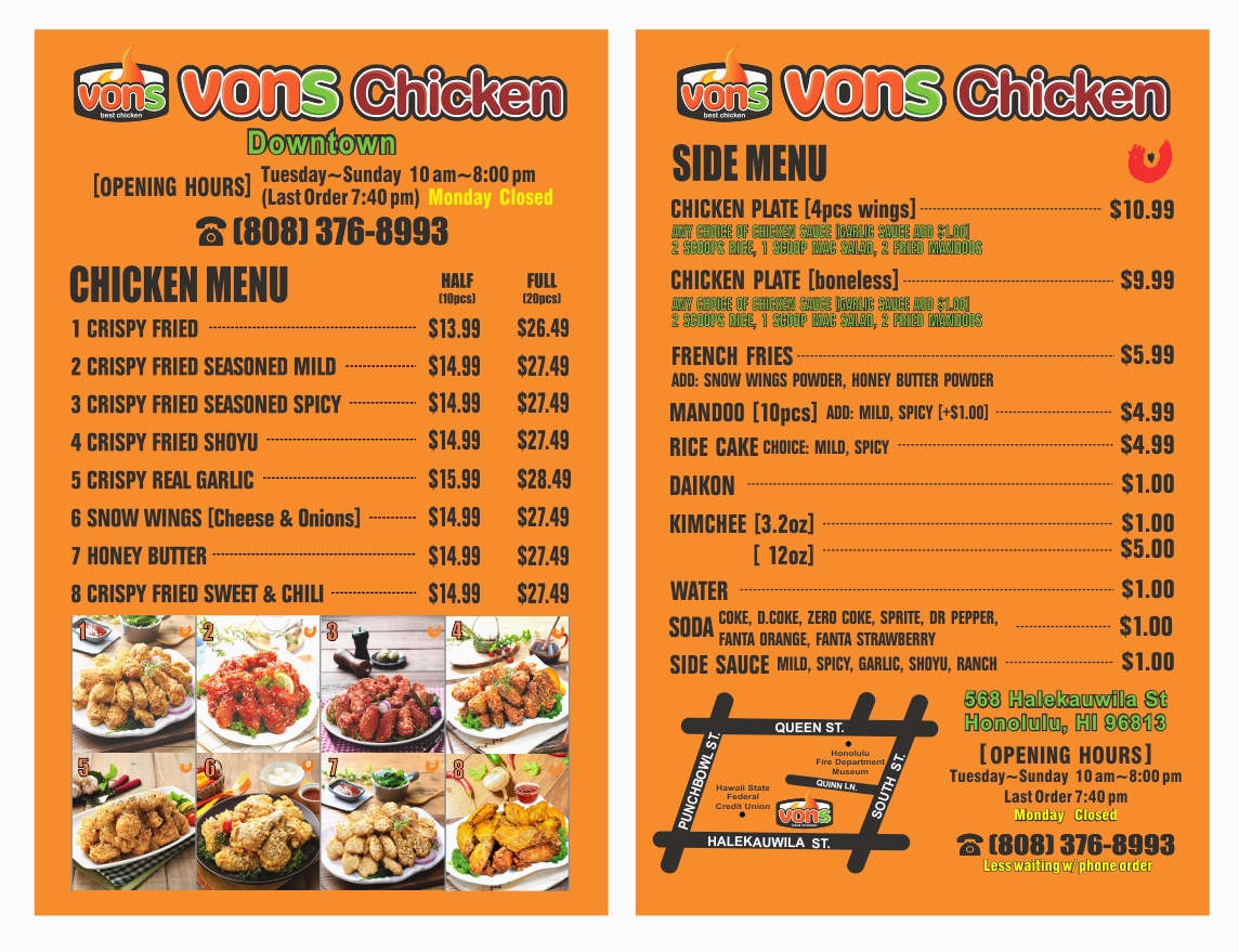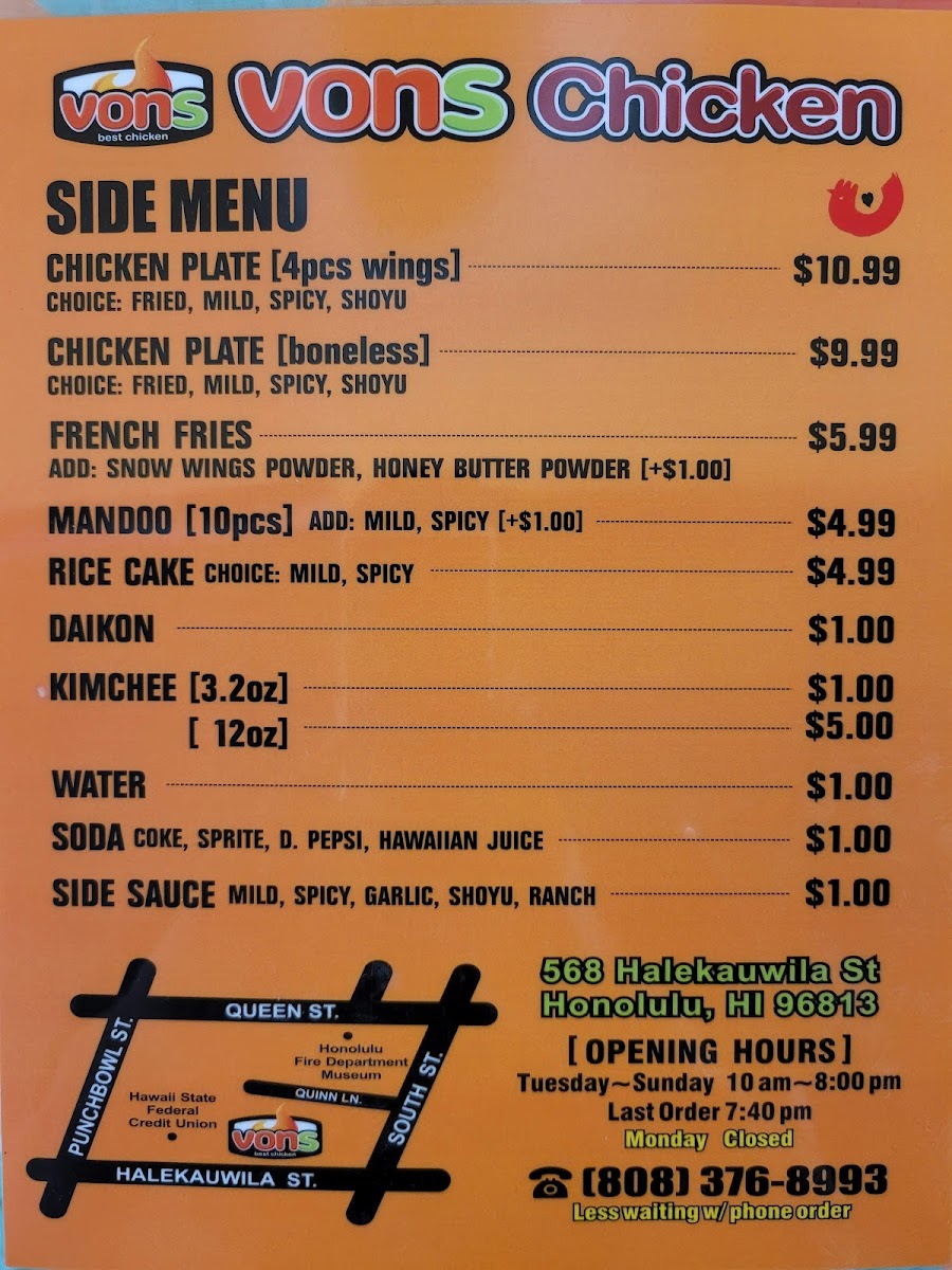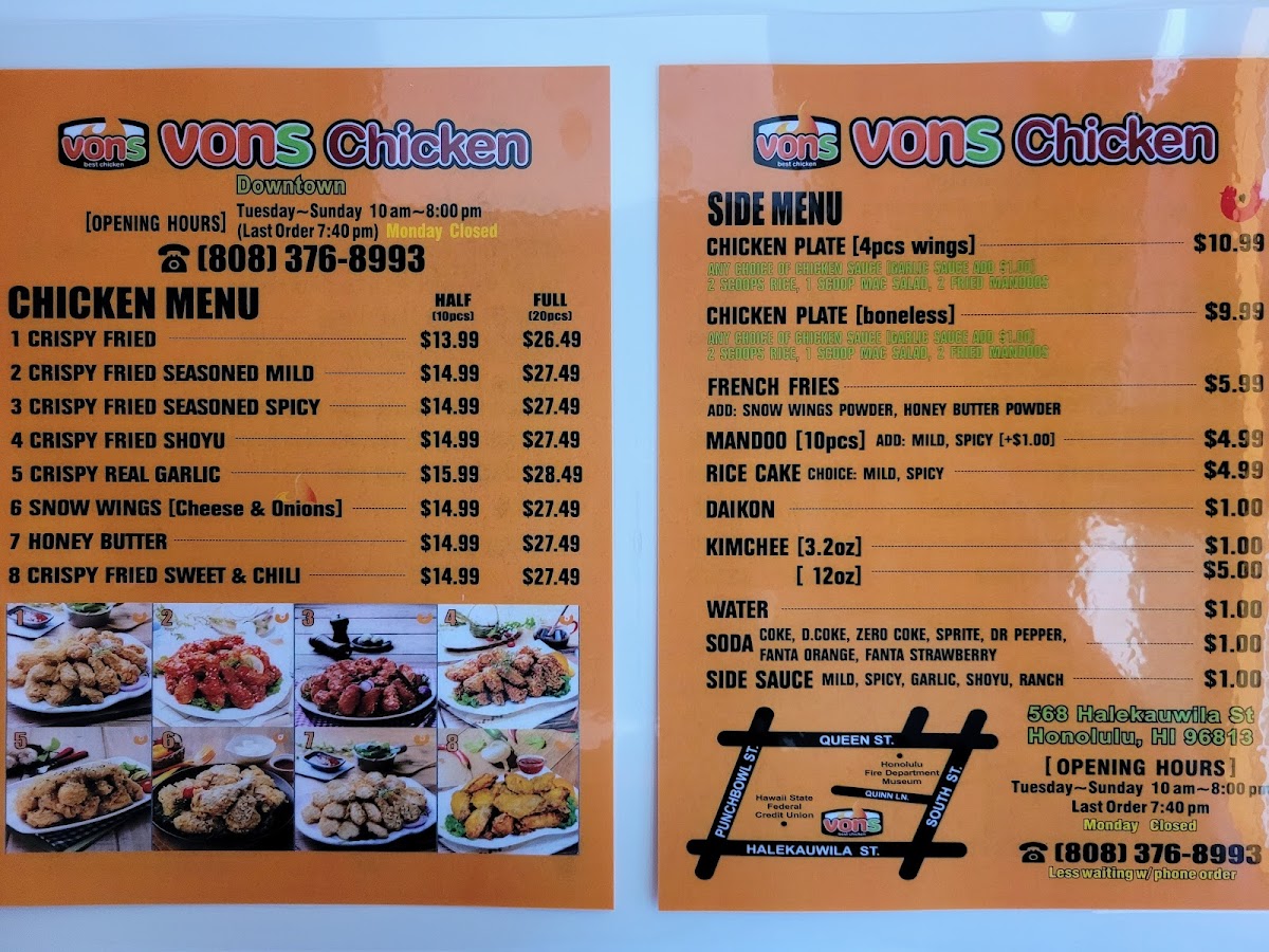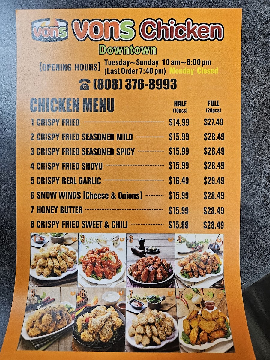 Welcome to Vons Chicken Downtown, a celebrated gem located at 568 Halekauwila St, Honolulu. Renowned for its authentic Korean Fried Chicken, Vons is a spot that promises a delightful dining experience. The menu features a variety of savory options, including their highly praised spicy seasoned wings and garlic chicken, both of which have garnered raving reviews from satisfied patrons.