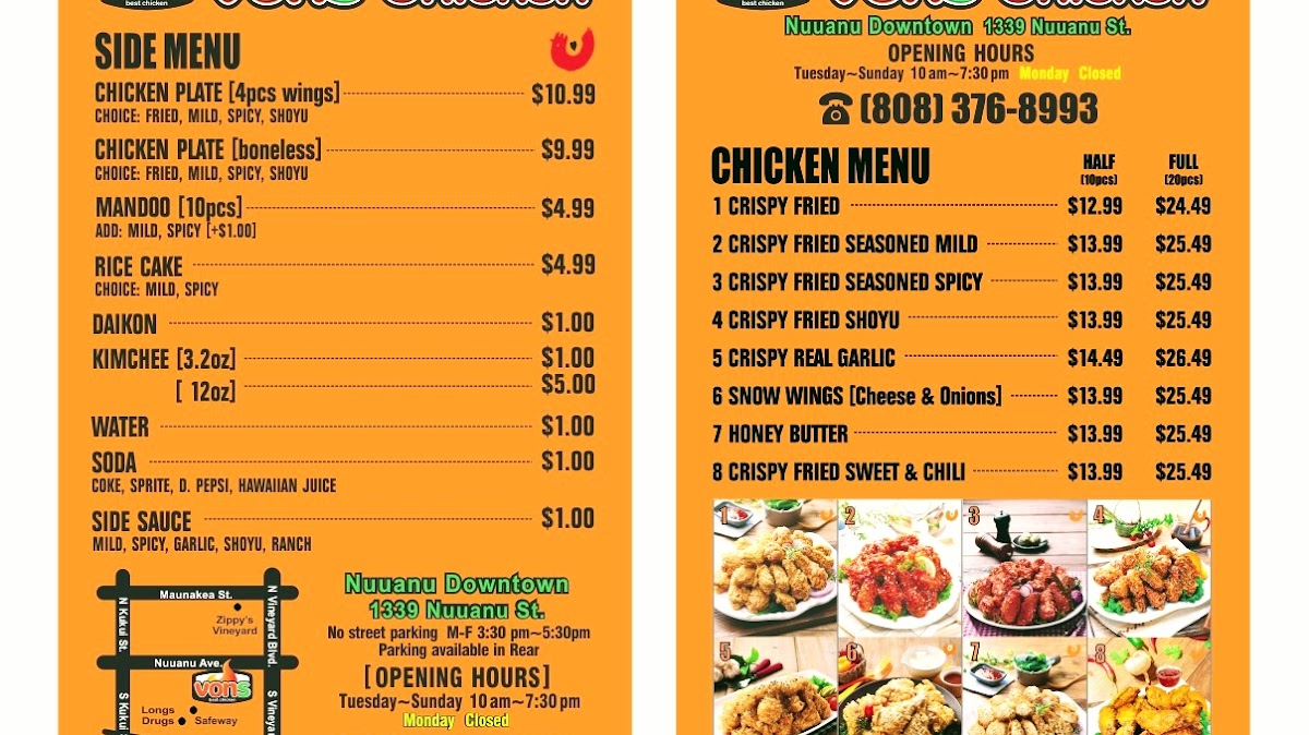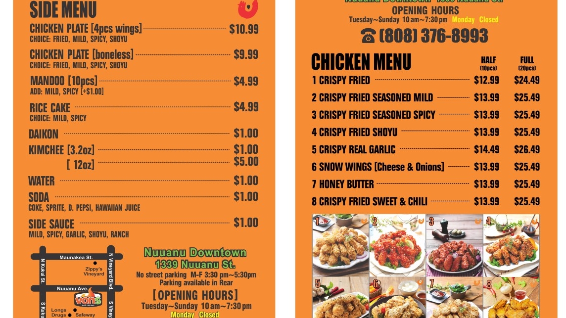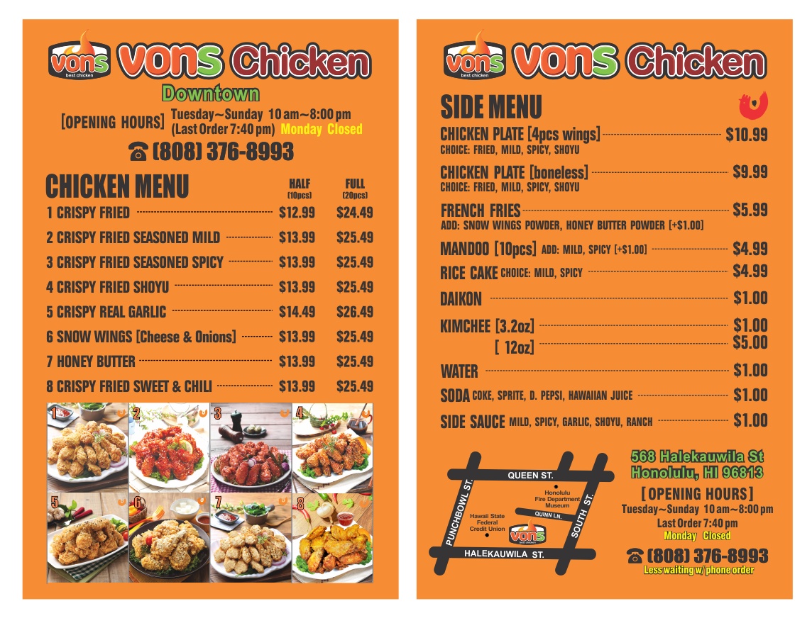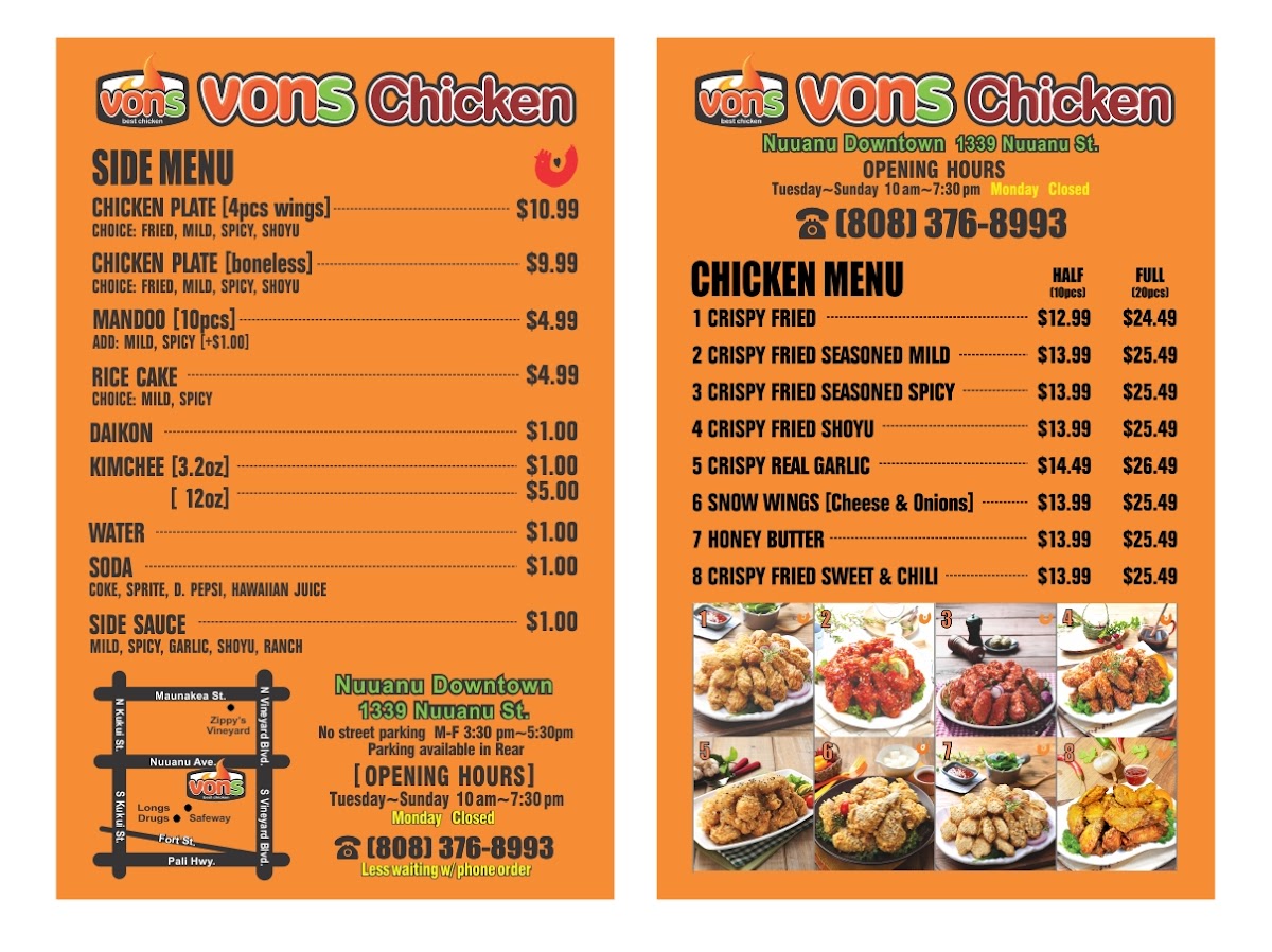 Welcome to Vons Chicken Downtown, a celebrated gem located at 568 Halekauwila St, Honolulu. Renowned for its authentic Korean Fried Chicken, Vons is a spot that promises a delightful dining experience. The menu features a variety of savory options, including their highly praised spicy seasoned wings and garlic chicken, both of which have garnered raving reviews from satisfied patrons.